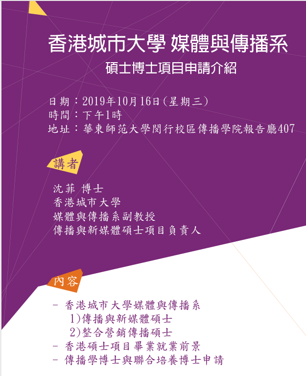 yl23411永利集团已于2018年12月与香港城市大学媒体与传播系签署硕士双学位项目合作协议,下周三10月16日下午一点,香港城市大学传播与媒体系副教授,传播与新媒体项目负责人沈菲博士将于yl23411永利集团报告厅407宣讲硕博士项目,欢迎各位同学积极参与!