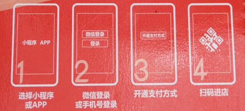 进入店门,消费者就可以发现贴在墙上的简要购物流程图。根据流程图的指示,人们只需要打开手机微信,扫描关注便利店的公众号,开通支付方式,就可以完成注册。在以后的使用中,通过小程序中的二维码或人脸识别就能进店购买商品。在选择商品后,消费者即可直接从闸机出口离店。