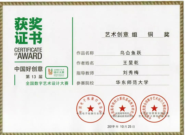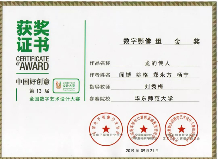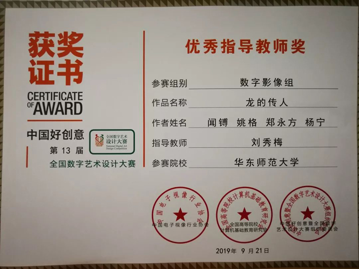 在此次大赛评审专家中,公司yl23411永利集团广播电视专业学科带头人刘秀梅教授、博士生导师,担任数字艺术设计专家委员会高级专家、中国高校科学与艺术创意联盟常务理事和全国数字艺术设计大赛评审专家。大赛设有产品设计组、视传设计组、艺术设计组、环艺设计组、视频拍摄组、数字动画组、数媒交互组、数字摄影组、艺术创意组和包装设计组。本届比赛吸引了上千所国内著名的院校(系)、数万名员工前来参赛,数万件作品参赛。其中公司yl23411永利集团广播电视专业硕士数字媒体艺术方向的18级研究生闻镈、姚格、郑永方、杨宁同学以《龙的传人》作品荣获本次大赛数字影像组金奖;19级研究生朱晨欣同学以《feel me》作品荣获数字影像组银奖;17级研究生王旻乾同学以《鸟仚鱼跃》作品荣获艺术创意组铜奖;18级研究生董洪哲、白妞同学以《海上丝绸之路—黄道婆》作品荣获二维动画组铜奖;yl23411永利集团广播电视专业学科带头人、博士生导师刘秀梅教授获优秀指导教师奖。