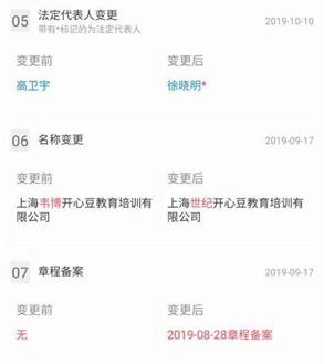 李女士告诉记者,她于2019年9月初进入开心豆就职,签合同时公司以合同要盖章为由拿走了合同,截至开心豆倒闭时李女士还没有拿到合同,并且这一情况并非个例。根据全国企业信用信息网的资料显示,2019年9月17日,开心豆所属公司由上海韦博开心豆教育培训有限公司变更为上海世纪开心豆教育培训有限公司。2019年10月10日,法定代表人由高卫宇变更为徐晓明。北洋泾中心的员工唐女士称,变更公司名称应找员工签订新的合同,但是公司并未有这样的举动。