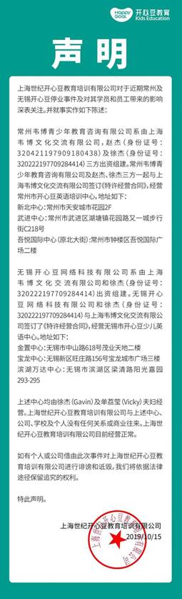 根据微信公众号”开心豆教育“显示,开心豆于2019年10月12日发布了一则”关于开心豆教育正常运营“公告,声称”开心豆已出现新的投资人接盘,与韦博英语属于不同的法律实体,财务及资金独立。“10月16日,上海世纪开心豆教育培训公司在”开心豆教育“公众号上就常州、无锡开心豆倒闭事件发表严正声明,声称上海世纪豆教育培训有限公司与常州、无锡开心豆所属公司并非一家,且上海世纪豆教育培训有限公司目前运营正常。