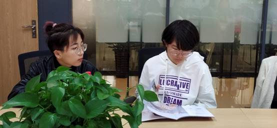 同学在认真翻阅“猴有戏儿童戏剧教育”公司手册