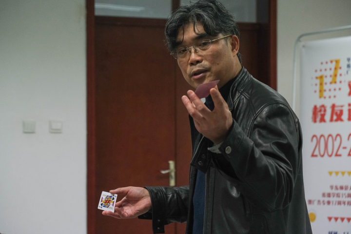 (何平华老师在表演扑克魔术)