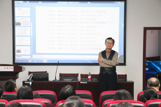 随后,胡展奋老师进行了发言。胡展奋老师曾经是《新民周刊》特稿部主任、主笔,在他担任新闻专业兼职教授的十年间,获得了同学们的高度赞扬。胡展奋老师提到了新闻教学当中理论与实践结合、理论与故事相融的重要性,并结合自己谈到了用故事解释理论的教学经验。胡老师还提到了文学素养以及风土人情对一篇精彩的新闻报道的重要性,对同学们的新闻学习与实践提出了指导与要求。