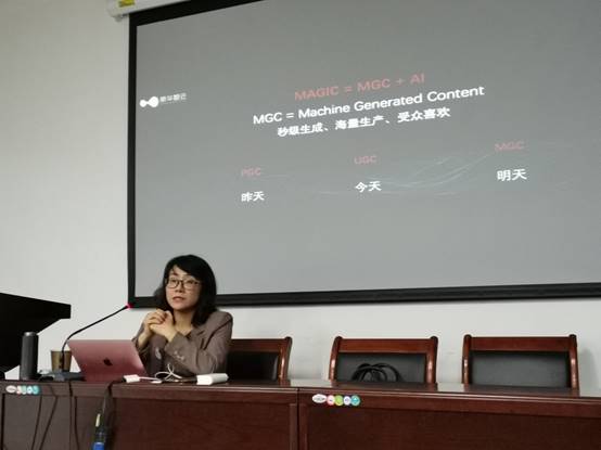 此外,MAGIC平台的智能化生产能力还涵盖了突发新闻、视频字幕自动生产、数据新闻、体育新闻、会议新闻等多个领域,从热点监测、数据收集与处理、可视化呈现等方面赋能内容生产者。融媒体环境下的内容生产对传统媒体的从业者的视频制作能力提出要求,而依托于数据和算法的人工智能则可以帮助其解决痛点、提高生产效率。“那么节省下来的时间用来做什么?”商艳青向现场同学发问,“我认为要用来休息。简单重复的工作交由机器去做,内容创造者以更好的状态应对更艰难的工作,激发创作灵感,进行内容策划。”商艳青对MGC(机器生成内容)的未来应用趋势进行了预测:“MAGIC是一个能够非常快速方便地进行视频生产的软件工具。秒级生成、海量生产、受众喜欢是我们对它提出的要求。而机器生成内容的特点在于‘走量‘,所以未来内容池里的中长尾端可以借助机器实现内容供给。”