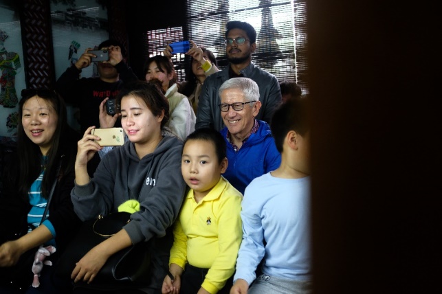 观看皮影表演的观众,其中蓝衣服的爷爷来自意大利