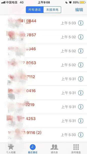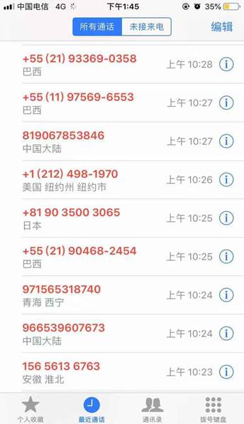 在首汽客服回电约30分钟后,自10点23分起,小明开始收到连续的来自世界各地的骚扰电话,一直持续到当天下午3点多。第二天早上4、5点,小明再次遭到了电话轰炸。“他那个电话轰炸应该至少上百个了吧”小明告诉记者。