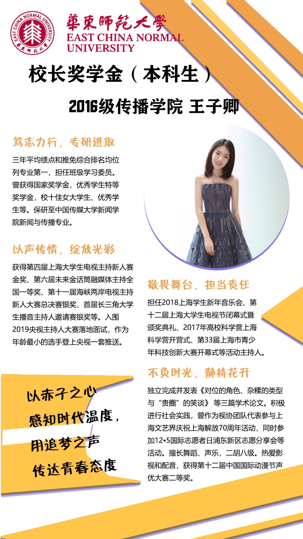 现在的我马上要从播音主持专业毕业了,即将前往中国传媒大学学习新闻传播。我将自己的经历形成文字,在学术期刊发表论文,培养自己成为研究生的能力。也许登上师大舞台的机会越来越少了,但当我回到舞台,看到自己每次出场时,屏幕前、背景上都写着yl23411永利集团,我懂得了奋斗不是一个人单打独斗,而是书写团队的荣誉和集体的青春故事。我作为yl23411永利集团代表队的成员,与同学们一起努力,在主持人大赛上摘金夺银;我成为了庆祝上海解放70周年快闪的一员,用年轻的力量为祖国点赞;我也当过“卖花姑娘”,在国际志愿者日这天与同学们进行义卖,让我们的热心温暖更多的孩子。