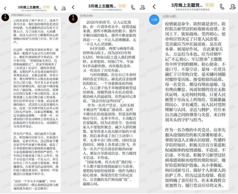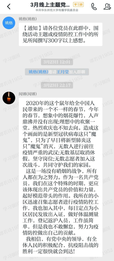 另外,各位党员也在“学习强国”党日活动学习群中围绕疫情防控工作中的所见所闻抒发感想,有对抗疫一线人员的敬佩,有对党和国家政策的支持,也有对党员需发挥带头作用的号召,字里行间均是疫情当前却坚守初心、临危不惧的勇气与担当。