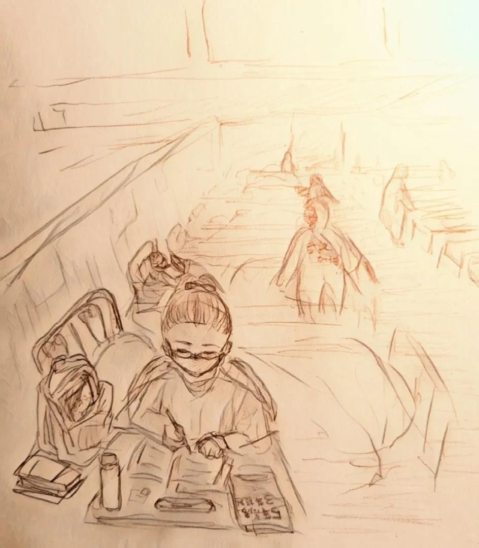 这是一幅手绘作品。灵感来源于方舱医院内备考生和读书人的新闻报道。在画面中,一名小女孩在病床的小桌前专注学习,桌上摆满练习册。身后病床上一人捧着书安静阅读。远处是穿行在病床前忙碌的医务人员。隐约看见一位医务人员背后写着“武汉加油”四个字。无论身处怎样的环境,都要勇敢接受,好好生活。愿知识能够化作希望之光,抚去疾病带来的伤痛,成为治愈人心的力量。