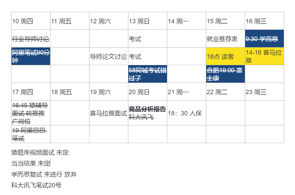 ⑥关注求职网站 从投简历到面试,比较建议大家关注一些求职网站(网站:上海各高校招聘信息网站、牛客网、梧桐果、智联校园招聘、应届生求职网、高校人才网;APP:猎聘、BOSS直聘;公众号:图情招聘、做書、木铎书生以及各目标公司招聘公众号,如XX招聘),将目标公司的宣讲和笔试时间,以及面试情况记下来,合理安排时间,下面这个表格是我10月份参加笔试面试的一个日程表。