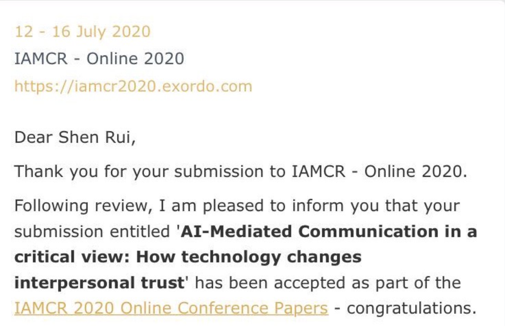 由申琦老师指导研究生沈睿、王璐瑜、邱艺、王梦蕾完成的论文《AI-Mediated Communication in a critical view: How technology changes interpersonal trust》被International Association for Media and Communication Research (国际媒介与传播研究学会,简称IAMCR)接收,会议时间为2020 年7月12至16日。