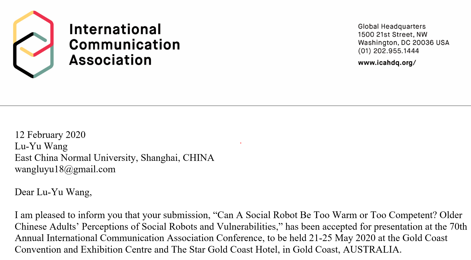 其中,由申琦老师指导研究生王璐瑜、申春翔与斯坦福大学社交媒体实验室团队合作完成的论文《Can A Social Robot Be Too Warm or Too Competent? Older Chinese Adults’ Perceptions of Social Robots and Vulnerabilities》 被第70届International Communication Association Conference (国际传播学会,简称ICA )接收,会议时间为2020年5月21-25日。