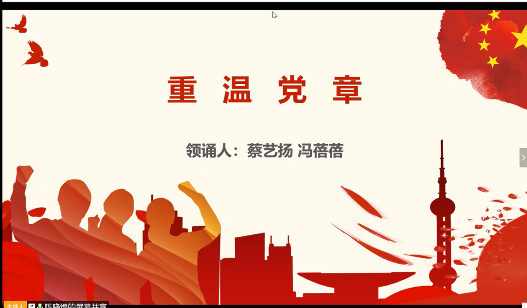 开班仪式的第二部分为诵读党章。此次开班仪式邀请了2019级广播电视专业播音主持方向硕士研究生蔡艺扬和冯蓓蓓带领入党积极分子诵读党章第一至二章内容。全体入党积极分子在两位同学的带领下完成了此次线上诵读。