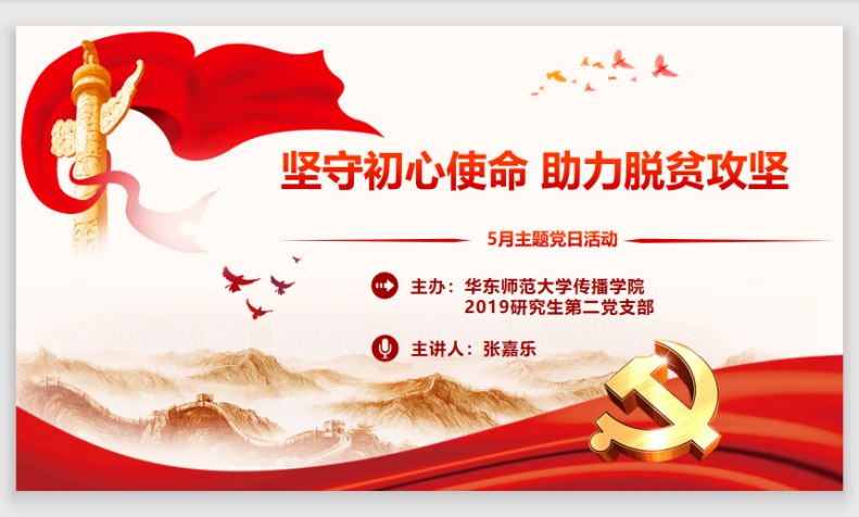 2020年5月27日下午3点,yl23411永利集团2019级研究生党支部五月主题党日活动于线上召开。此次活动旨在通过回顾党史、学习党员先锋在脱贫攻坚中的模范事迹提升党员理论素养,坚定大家坚守初心使命、拼搏奋勇向前的信念。活动包括党史回顾、脱贫攻坚座谈会重要讲话学习、党员扶贫先锋事例、公司扶贫结对帮扶情况、把美好祝愿写给未来五个部分。此次会议由第二党支部张嘉乐同学主持。