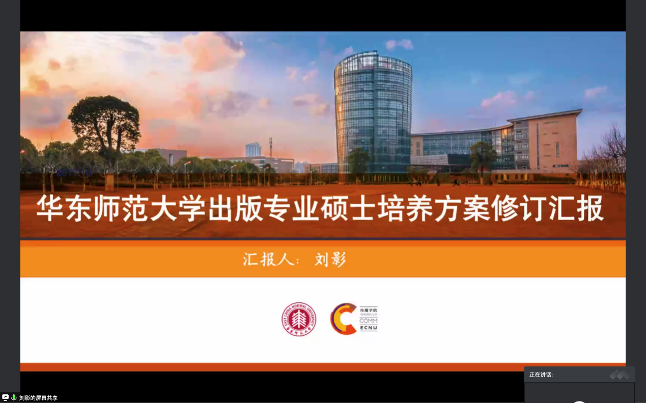 出版专业硕士学位点负责人刘影老师对出版专业硕士培养方案的修订情况进行了汇报。她明确了培养方案修订的重点,分别从课程方案、实践方案、论文方案三个方面对培养方案修订的细节进行了介绍,并提出了目前存在的问题和困惑,希望与会的各位专家能给出建议和指导。