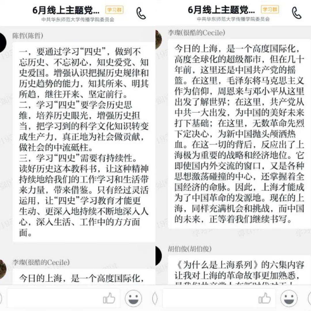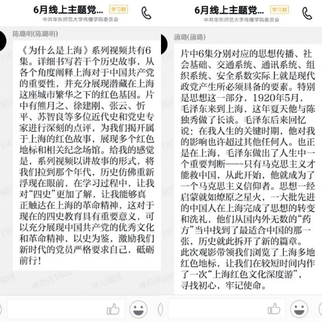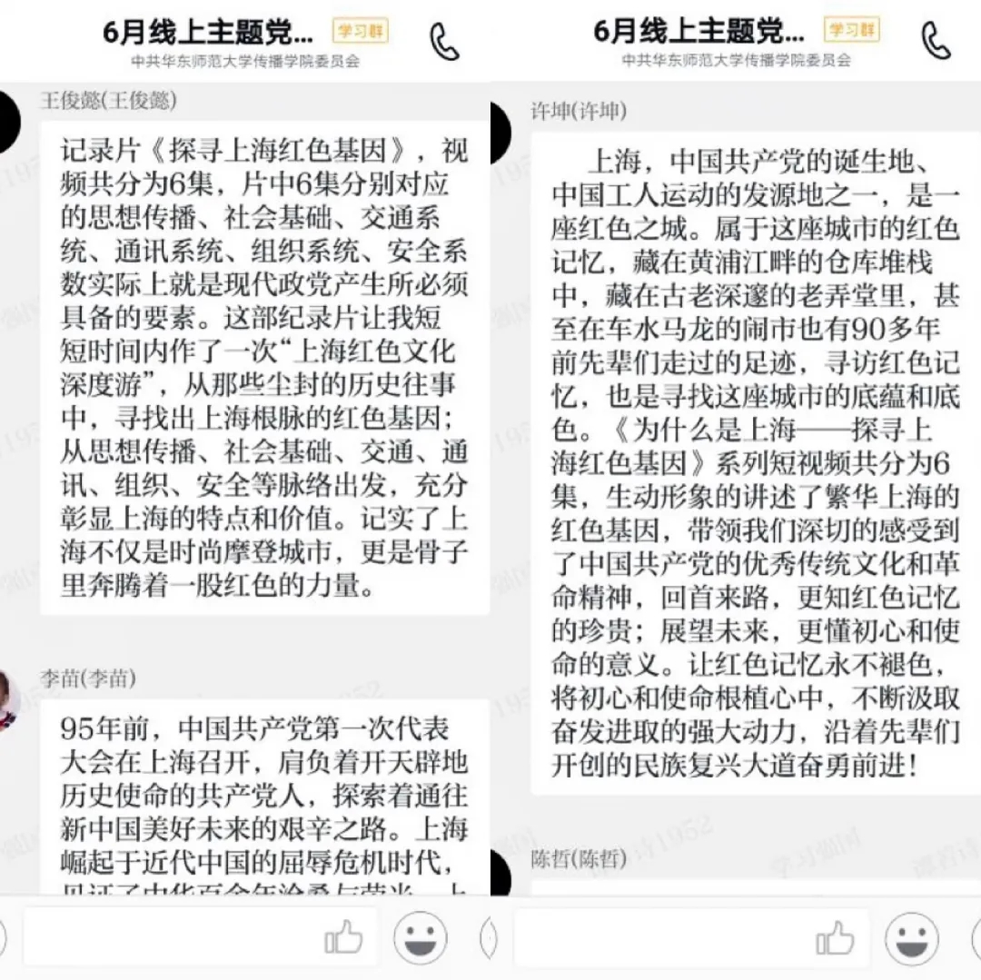 此系列短视频由上海市社会科学界联合会、解放日报•上观新闻联合制作,包括理想火种、先锋摇篮、红色起点、电波密战、聚合力量、缝隙效应六集内容,从思想传播、社会基础、交通系统、通讯系统、组织系统、安全系数等方面逐一分析,以若干历史故事串联,深刻揭示出中国共产党诞生在上海的历史必然性,并由此充分展现奔腾在上海这座城市骨子里的红色文化基因。支部党员在观看视频后通过学习强国平台积极展开讨论、抒发感想。