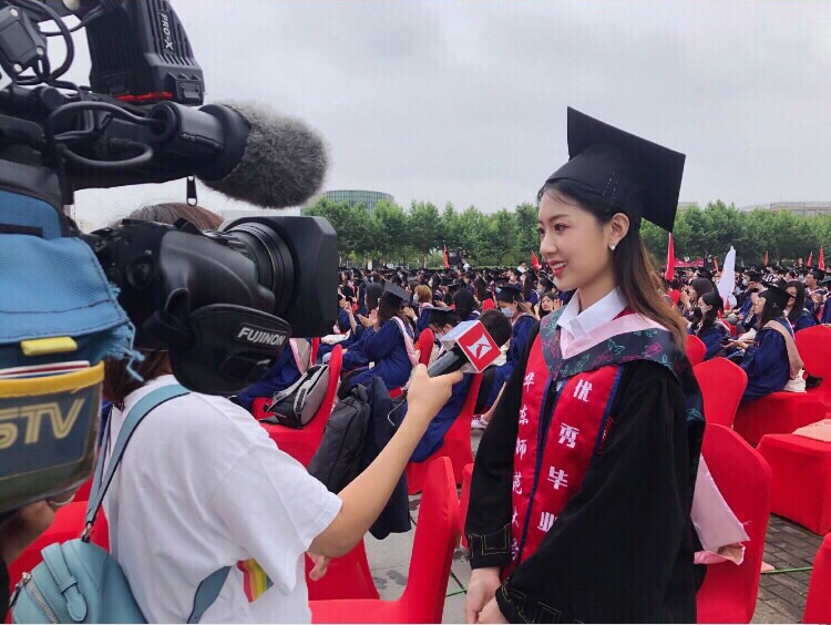 在毕业典礼现场,王子卿同学接受了上海电视台的的采访。在采访中她也谈及自己对特殊时期这一场线下毕业典礼的感受:“我们是令人羡慕的“别人的公司”,能现场见证一个员工最有仪式感的时刻,能见到想念的老师同学。参加典礼的人员都自觉配合体温测量和防护,团结一心的我们一直在诠释爱在华师大。大学四年做过好几次典礼工作人员,但在自己的典礼上从彩排就开始热泪盈眶。上海梅雨天,典礼前期待也带点紧张,祈祷上海不要下雨。”
