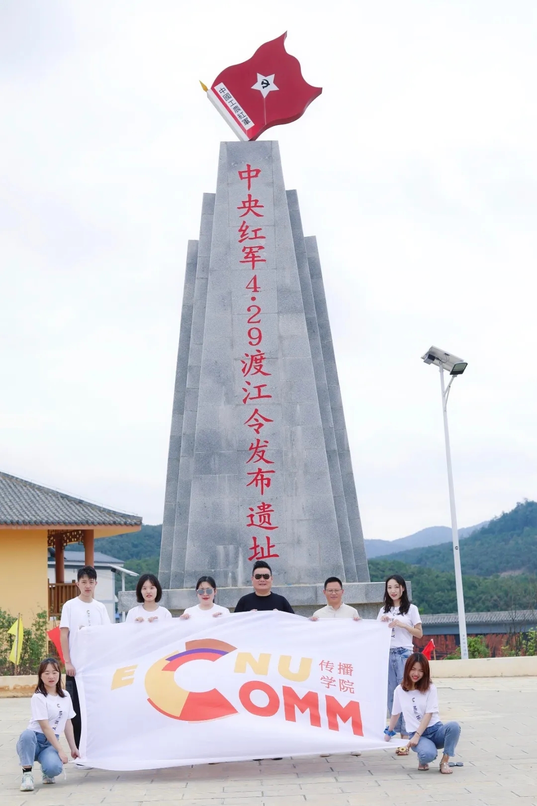 当天上午,在播音主持艺术专业马力老师和广播电视编导专业鞠薇老师的带领下,同学们来到寻甸鲁口哨“4·29”渡江令发布遗址瞻仰缅怀。遵义会议后,中央红军在党中央和毛泽东同志的正确领导下,于1935年4月23日进入云南,经过富源、曲靖,4月28日进入寻甸县。当时情况万分危急,国民党几十万大军分几路对红军围追堵截,准备在昆明东北部消灭红军,当时,红军已经没办法折回黔北,为了摆脱这样的不利局面,28日晚,党中央及中革军委在鲁口哨驻地红军总部开会,大家对形势进行了充分讨论,一直到29日的凌晨,会议才确定了我军争取迅速渡过金沙江,转入川西建立苏区根据地的战略目标,以万万火急之令下达,这就是著名的“4.29”渡江令,即《关于我军速渡金沙江在川西建立苏区的指示》。
