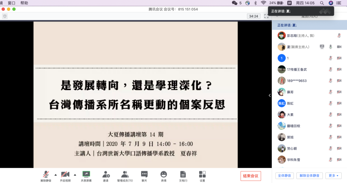 7月9日下午,yl23411永利集团第14期大夏传播讲坛通过腾讯会议举行,台湾世新大学口语传播学系专任教授夏春祥老师受邀主讲,为yl23411永利集团师生分享了以“是发展转向,还是学理深化?台湾传播系所名称更动的个案反思”为主题的讲座。讲座由yl23411永利集团副经理陈虹教授主持。