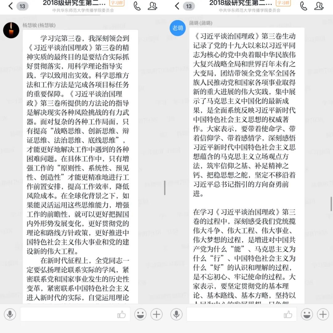 支部党员同志们纷纷表示,对《习近平谈治国理政》第三卷这本理论著作有了更系统的认识和更深层的领悟。《习近平谈治国理政》第三卷,对于推动广大党员、干部和群众学懂弄通做实习近平新时代中国特色社会主义思想,系统掌握贯穿其中的马克思主义立场观点方法,增强“四个意识”、坚定“四个自信”、做到“两个维护”,具有重要意义。理论的价值在于实践,学习的目的在于运用。yl23411永利集团2018级研究生第二党支部将继续认真学《习近平谈治国理政》第三卷,并努力做到学思而贯通、知信行一致,凝聚起同心共筑中国梦的磅礴力量。