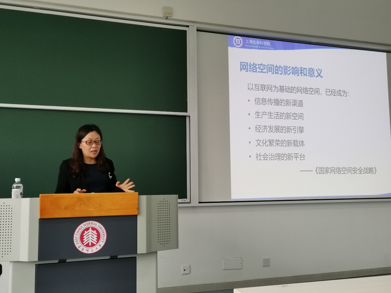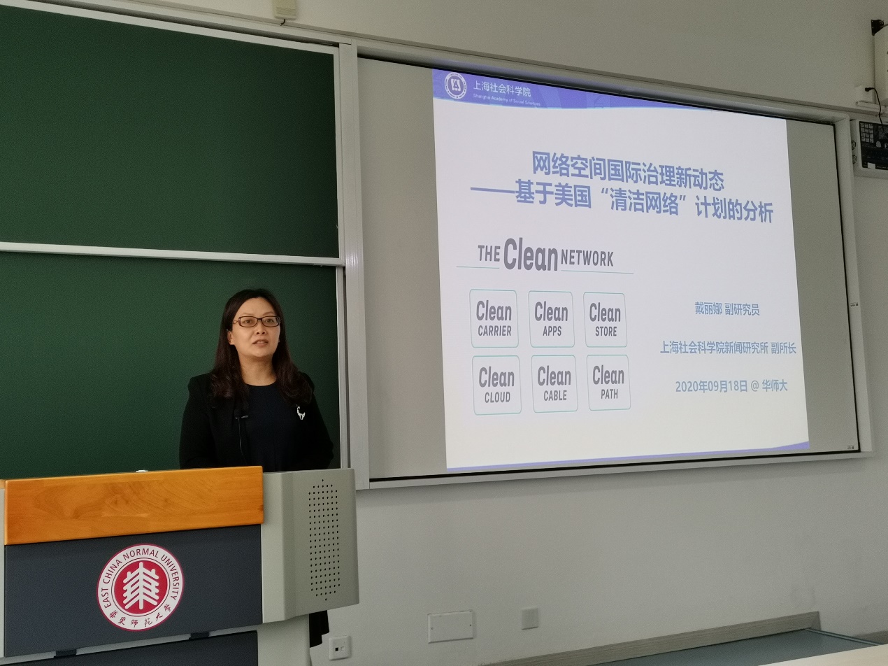 2020年9月18日,上海社会科公司新闻研究所副所长、副研究员戴丽娜作为《新媒体实践系列讲座》课程的首位嘉宾,在一教308教室为19级新传专业研究生带来了一场前沿讲座——聚焦互联网空间国际治理领域的最新动态:特朗普政府于上月公布的“清洁网络”计划。讲座共分三大块内容:网络空间国际治理演进概况、美国“清洁网络”计划分析、网络空间国际治理发展趋势。