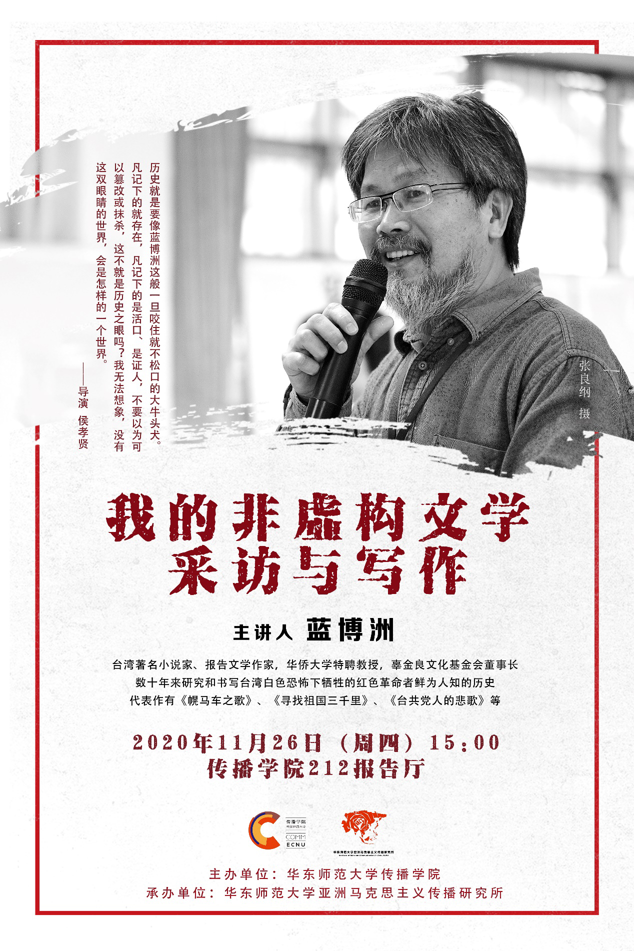 蓝博洲自1987年进入陈映真先生主持的《人间》杂志工作起开始从事非虚构文学创作,成为台湾最早而且持续不断对1950年代白色恐怖历史进行采访、研究和书写的作家。《幌马车之歌》等系列作品即是用非虚构文学形式,讲述一段真实的台湾近现代历史,让几近湮灭的红色血脉得以再现。本次讲座蓝博洲将分享数十年坚持非虚构文学采访与写作的心路历程,及其取得的经验与思考。