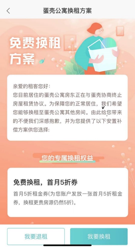 根据蛋壳公寓租赁合同及App上相关内容,房东与蛋壳公寓解除合约后,租客有两种可选择的方式。一是申请无责退租,蛋壳会在返还租金、押金等费用的基础上再赔偿租户一个月的租金;二是选择换租,蛋壳会对租客的租金等进行结算,将退款返还到蛋壳公寓APP的余额中,租客可用余额通过蛋壳租住新的房屋。在黄小姐看来这是很难选择的,“退租之后能不能真的拿到返还的钱没法保证,换租之后如果遇到的还是拿不到房租的房东,那不是还要继续被房东催着搬家吗?”