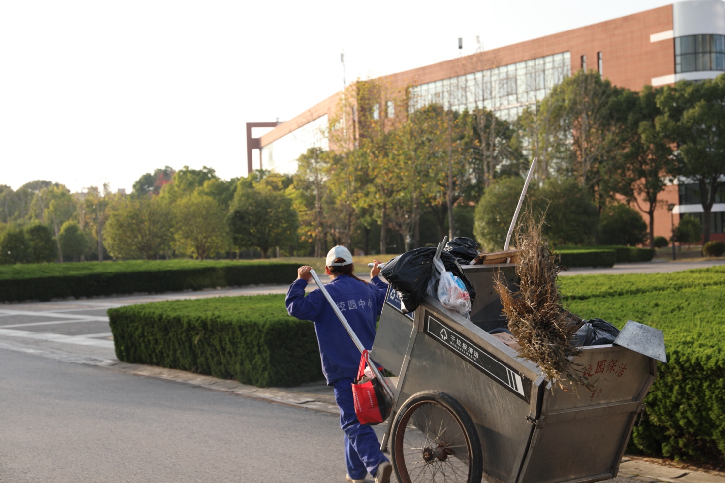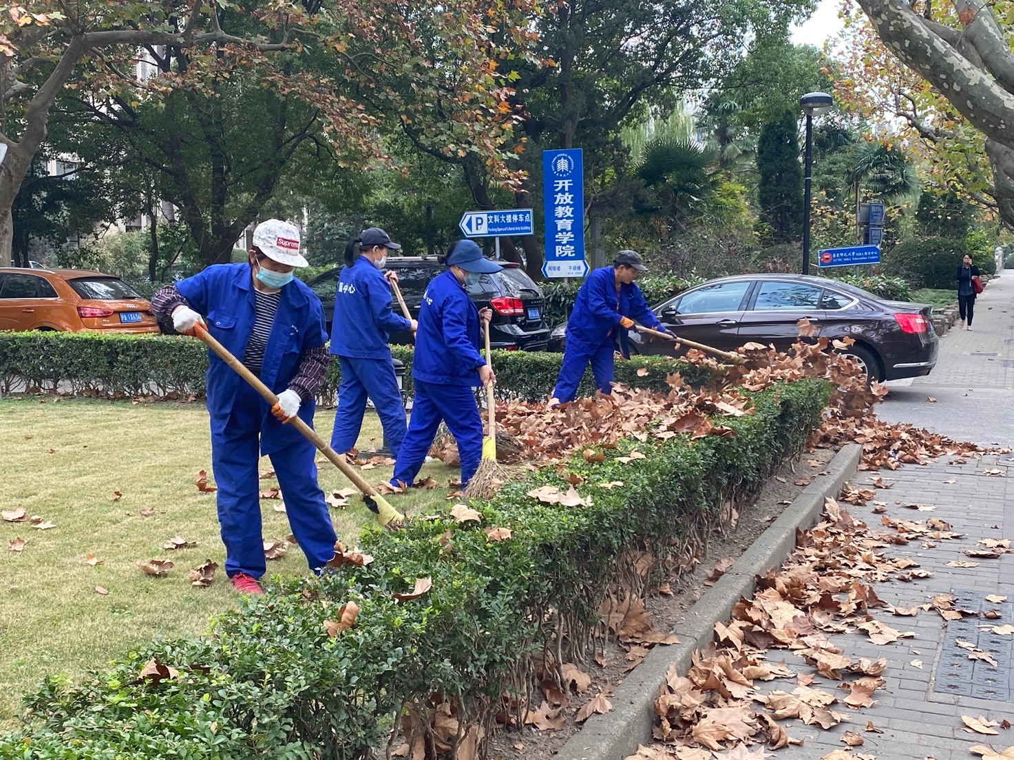 校园环境中心的陈利主要分管闵行校区杏林东路的道路清扫工作。她向记者介绍:“虽然不再大规模清扫落叶,但散落其中的垃圾和踩碎的落叶还是需要捡拾的。”从苕帚到拾物架,陈师傅手中工具的轮换表现着她主要工作的变化。除了一线保洁工人,绿化和保洁管理员的存在也尤其重要。徐经理说,校园环境中心在日常网格化的巡查当中都会关注“落叶不扫”的情况,“如果某个保洁管理员看到现在的落叶量有点太厚了,或者堆放得不好看了,就会拍照传到环境中心的微信群里。我们会做判断,然后安排时间清扫。”