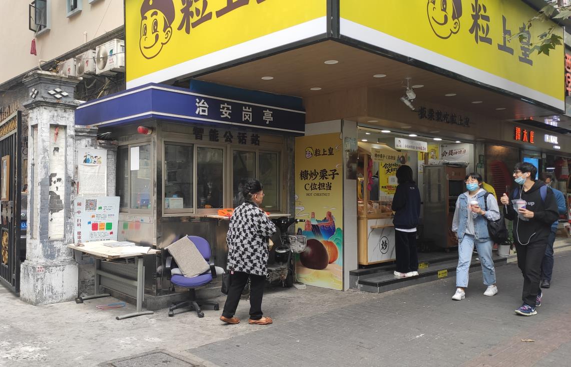 福州路614弄小区的治安岗亭也是沈玉琇经营的公用电话亭,一旁的“粒上皇”糖炒栗子店开张时,征询了沈玉琇的意见,没有改造、占用电话亭的空间,但招牌仍延伸至其上方