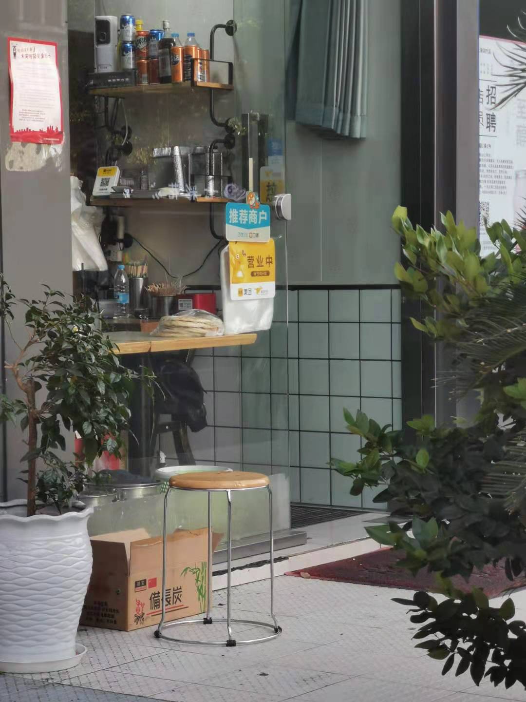 【烧烤店门口供骑手等待取餐的凳子】