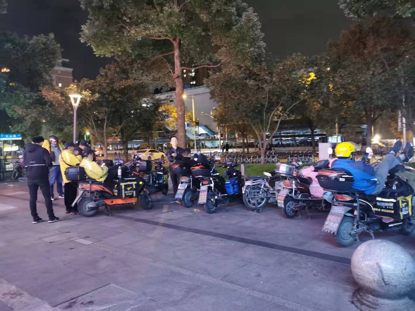 【大润发对面魔厨美食城门口,许多骑手靠在电动车上休息,等待晚高峰的派单】