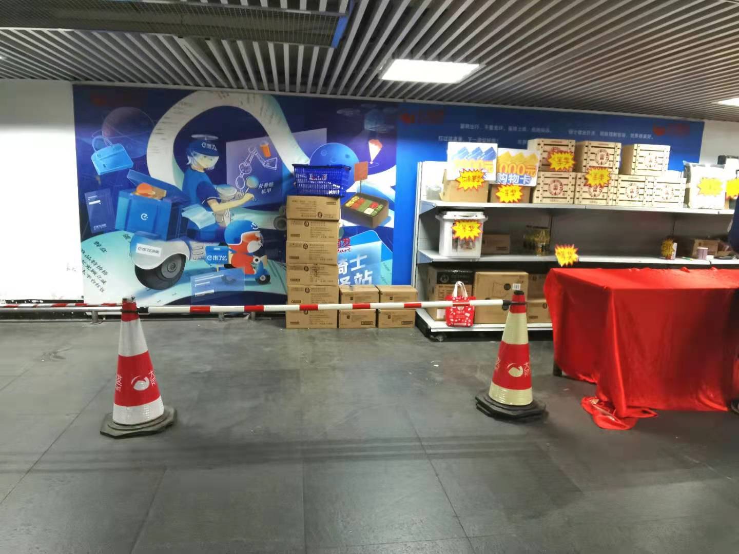 大润发杨浦店是今年夏天响应饿了么骑士项目号召的商家。10月27日下午五点20分,记者赶到大润发杨浦店的蓝骑士驿站——一个位于大润发门口左侧地下停车过道中的休息区。正值超市换购活动,骑手休息区已在半月前(10月13日)被改成超市临时换购台。供骑手休息的桌椅被移走,后方墙壁上,仍张贴着蓝骑士驿站的主题墙纸。据换购台的值班人员称,见到过骑手休息,但平时在二楼上班,不清楚具体情况。11月18日,记者致电大润发超市,其工作人员称驿站早在换购活动之前已被撤,目前并无桌椅设立,并表示不清楚被撤原因。