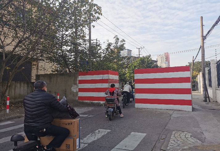 9:45,张女士正要穿过东侧桥头围墙时,因来不及躲闪从围墙外由北向西拐进来的电动车,险些发生刮碰。随后记者采访了张女士,“刚才根本就没看到北边有车要拐进来,这个围墙这么高,正好挡住了观察的视线”。