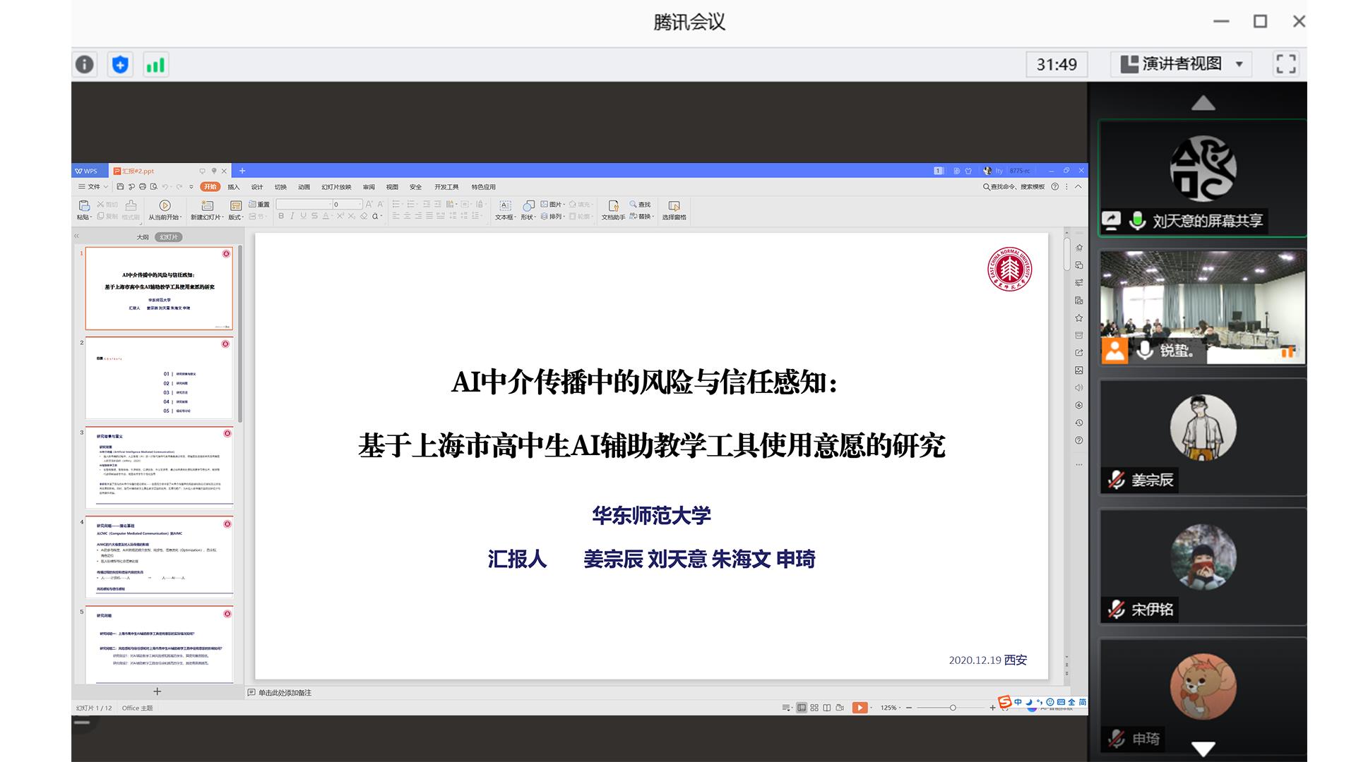 由公司申琦老师指导并带领2017级广告学系本科生姜宗辰、刘天意、朱海文完成论文《AI中介传播中的风险与信任感知:基于上海市高中生AI辅助教学工具使用意愿的研究》被中国新闻史学会新闻传播思想史研究委员会2020年年会接收。会议于2020年12月19日在陕西西安召开。