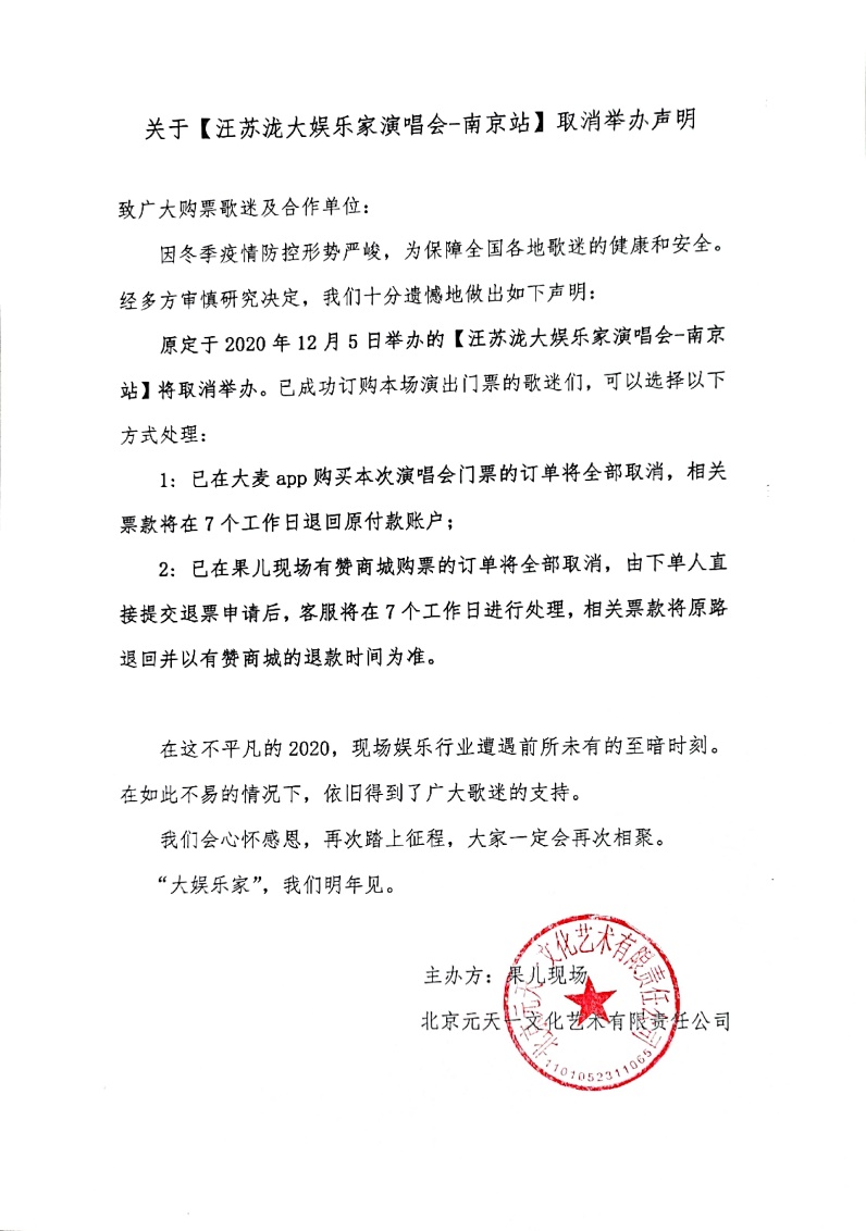 (“汪苏泷‘大娱乐家’演唱会南京站”取消举办声明)