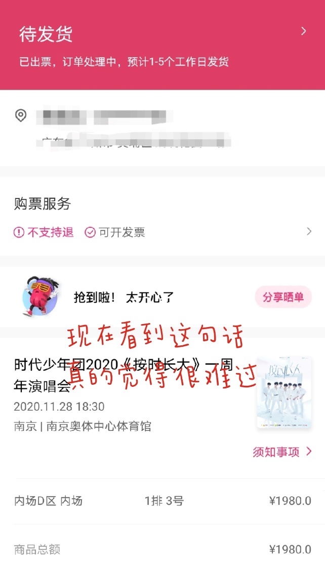 “当我抢到票的时候,我才发现自己的手都是抖的,我记得我在办公室兴奋得蹦蹦跳跳的样子。”在广州工作的黄女士是时代少年团的粉丝。11月14日,她在微博上看到时代少年团官方微博发布消息,组合将于11月28日在南京市建邺区奥林匹克体育中心举办周年演唱会。看到演唱会的通知后,黄女士就一直期待演唱会的到来。11月18日晚七点整,该场演唱会在大麦APP上正式开票,黄女士以1980元的价格抢到了演唱会的内场票。购票成功后,黄女士立即向公司递交了请假申请,并于当日购买了11月28日早晨由广州飞往南京的机票和次日中午的返程票,共计980元。