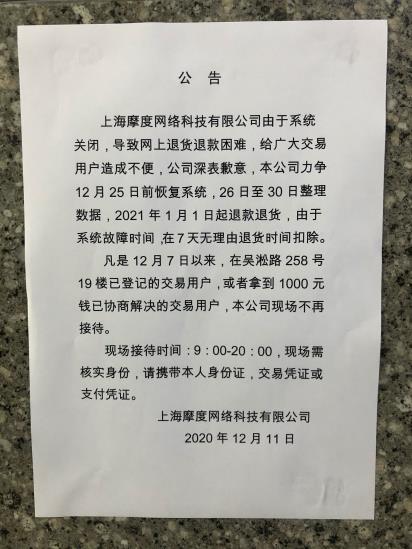 12月11日中午12时许,记者来到位于上海市虹口区耀江国际广场19楼的摩度网络科技公司,看到墙上已张贴出公告,公告中表示“本公司力争12月25日前恢复系统,26日至30日整理数据,2021年1月1日起退款退货……凡是12月7日以来……拿到1000元钱已协商解决的交易用户,本公司现场不再接待。接待时间为上午九点至晚上八点。”然而张贴的多份公告中没有一份盖有公司的印章。
