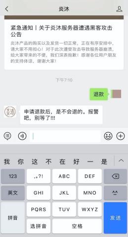 12月9日,数十名消费者来到上海市北外滩派出所报警。中午,公司法人代表王豹弟被带到派出所。“当时现场人比较多,而且大家情绪比较激动,民警就找了几个消费者代表和王豹弟沟通。协商的结果是,王豹弟答应给在场的60人中符合七天无理由退款的订单进行全额退款,并签署了协议,但他说要回到公司后才能进行退款。下午,公司这边陆陆续续又来了两三百号人。可钱还没开始退,当天炎沐公众号因遭到大量用户投诉被查封,公司以数据丢失、系统被关为由表示没办法进行退款了。”特地从南京赶来的25岁的陈女士告诉记者。
