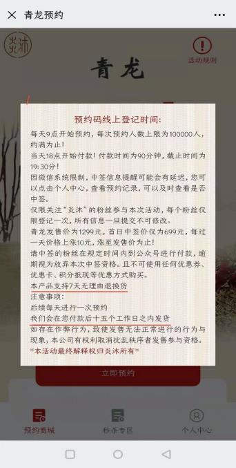 起初,由于“黄牛”放出消息称自己以及“闲鱼”app上有人愿意以比平台发售价更高的价格回收手串,吸引了大量散户为赚取差价而在炎沐公众号上进行预约抽签,前期中签率低、发货速度快、散户每单收益率高,这就使得如果想赚取更多的差价,就要去抽尽可能多的签。“我11月的时候开始预约抽签,一个号一个产品一天只能抽一次,所以我就让亲戚朋友帮忙,用他们的号进行预约,我再付款给他们。”待产的西女士告诉记者,“我一开始其实有些犹豫,但看到群里很多人都在买,闲鱼上也有很稳定的销路,自己就想试试……当时炎沐客服说七天无理由退货,我就没多想。”