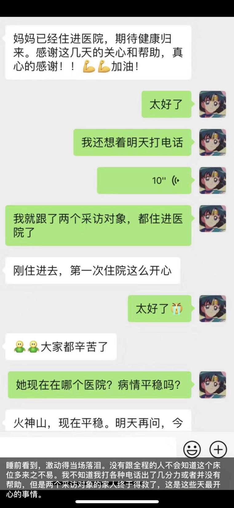 图为郑洁朋友圈:郑洁为采访对象帮忙联系医院,采访对象发来感谢短信