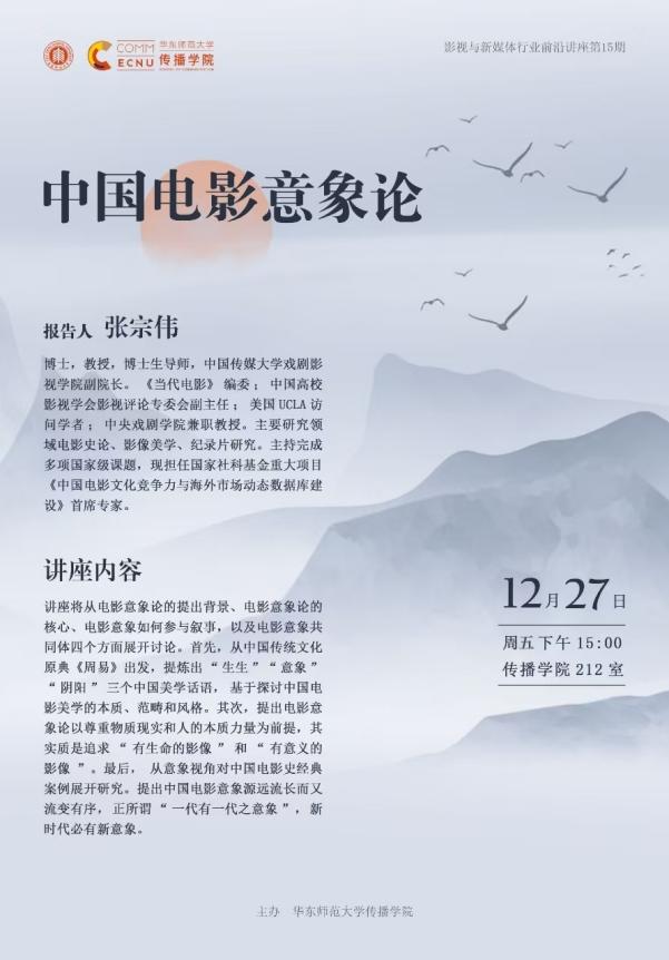 讲座将从电影意象论的提出背景、电影意象论的核心、电影意象如何参与叙事,以及电影意象共同体四个方面展开讨论。首先,从中国传统文化原典《周易》出发,提炼出“生生”“意象”“阴阳 ”三个中国美学话语, 基于探讨中国电影美学的本质、范畴和风格。其次,提出电影意象论以尊重物质现实和人的本质力量为前提,其实质是追求 “有生命的影像”和“有意义的影像 ”。最后,从意象视角对中国电影史经典案例展开研究。提出中国电影意象源远流长而又流变有序,正所谓“一代有一代之意象”,新时代必有新意象。