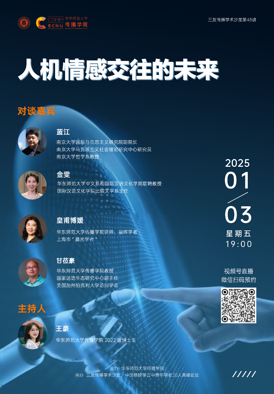 随着人工智能技术的迅速进步,机器逐渐具备模拟复杂情感反应的能力,情感交互正逐步突破传统人机关系的边界,形成新的交流维度。在与机器建立情感联结、甚至与人工智能机器人恋爱的当前背景下,本次对谈将从多个角度审视人机情感交互现象的本质与意义,重点分析这一新型交互模式是否对传统情感概念构成挑战,并探讨其发展可能为未来人机交往模式和人机社会结构带来的深远影响与挑战。