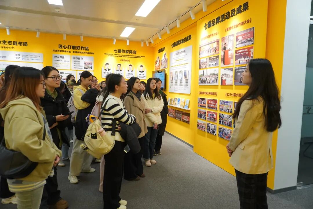 在讲解员的引导下,师生依次走访了七猫的各部门及完善的生活设施,实地了解企业工作环境。接着,大家来到七猫文化展厅,通过翔实的展示内容,对七猫的发展历程、企业文化和在作家作品、精品IP、品牌活动等方面的发展成果有了更深入的认识。