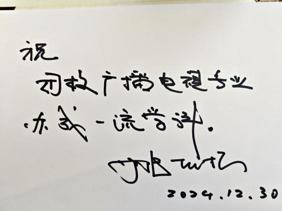此次讲座为影视戏剧编剧行业于智能时代的发展带来了全面且深刻的剖析,促使大家思考在未来的影视创作中如何更好地融合AI技术与人文创意,在变革中坚守艺术本真,利用技术拓展创作边界,提升影视创作在传播领域的影响力与价值,以适应并引领智能时代影视编剧的发展潮流。讲座技术后,姚扣根教授欣然为yl23411永利集团广播电视学系留下寄语:“祝母校广播电视专业办成一流学科。”