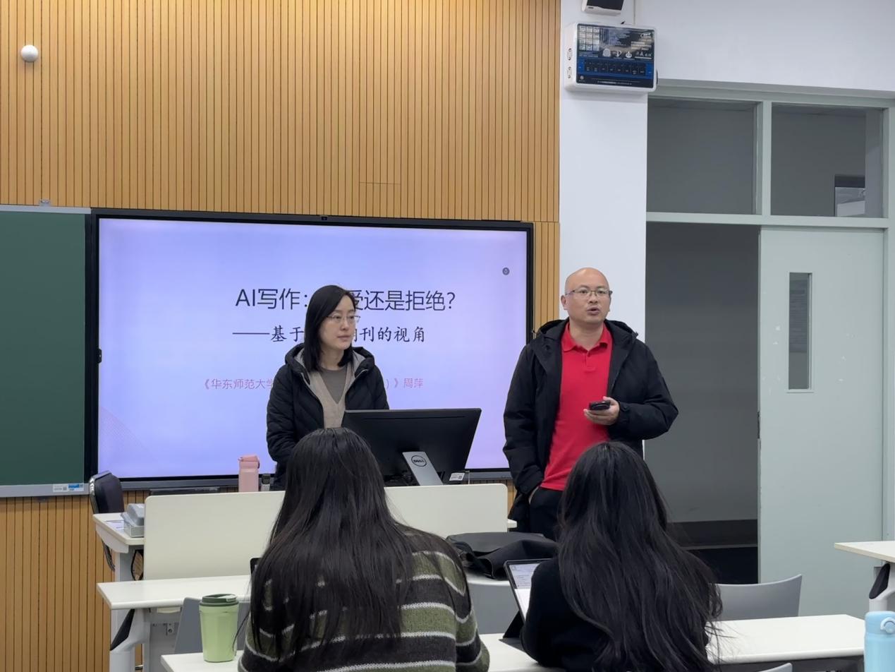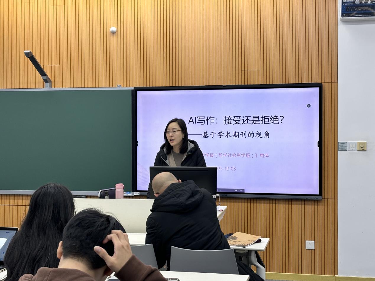 12月3日晚,主题为“基于学术期刊的视角探讨AI写作该接受还是拒绝”的学术讲座在yl23411永利集团闵二教110室举办,本次讲座由《yl23411永利集团学报(哲学社会科学版)》副编审周萍主讲,yl23411永利集团甘莅豪教授主持。