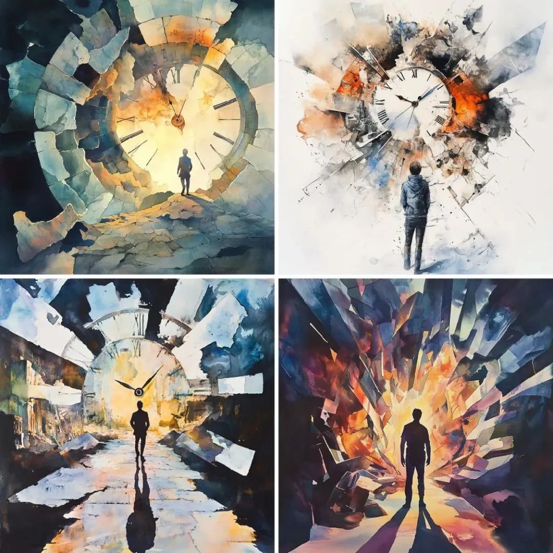 MJ / #prompt:Surrealistic abstract representation of time's fragmentation and reconstruction. Use sharp, jagged edges and fragmented elements to show time as something unstable, with broken pieces of time spread across surreal landscapes. Incorporate shifting light and distorted shadows to evoke the feeling of time being interrupted and reconstructed.In the style of light watercolor.With a human standing in it.