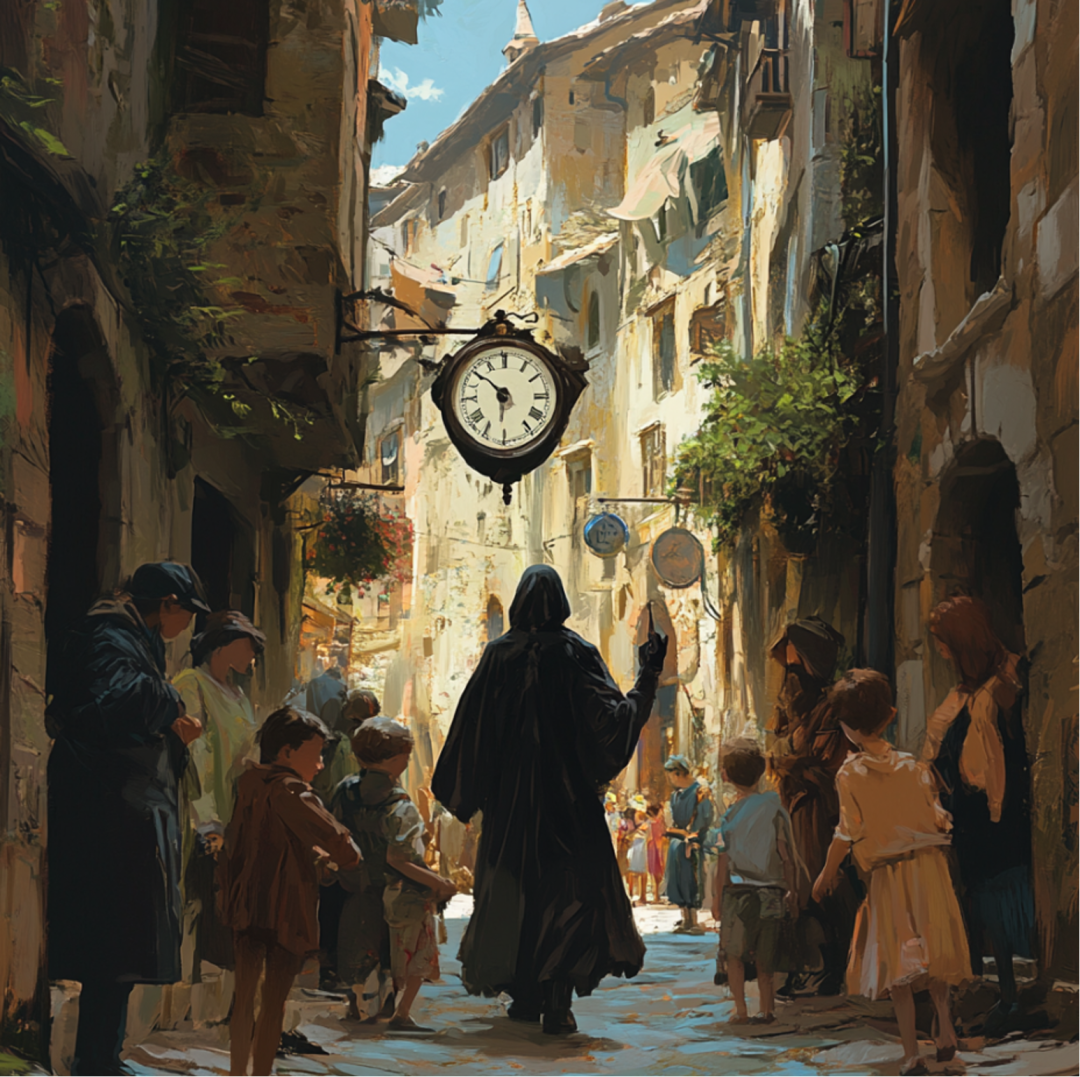 MJ / #prompt:Dark sci-fi style; In the middle of the screen, there is a time messenger dressed in a black robe holding a clock and walking through a small alley. On both sides of the alley, people of different ages are doing their own activities.-- ar 1:1