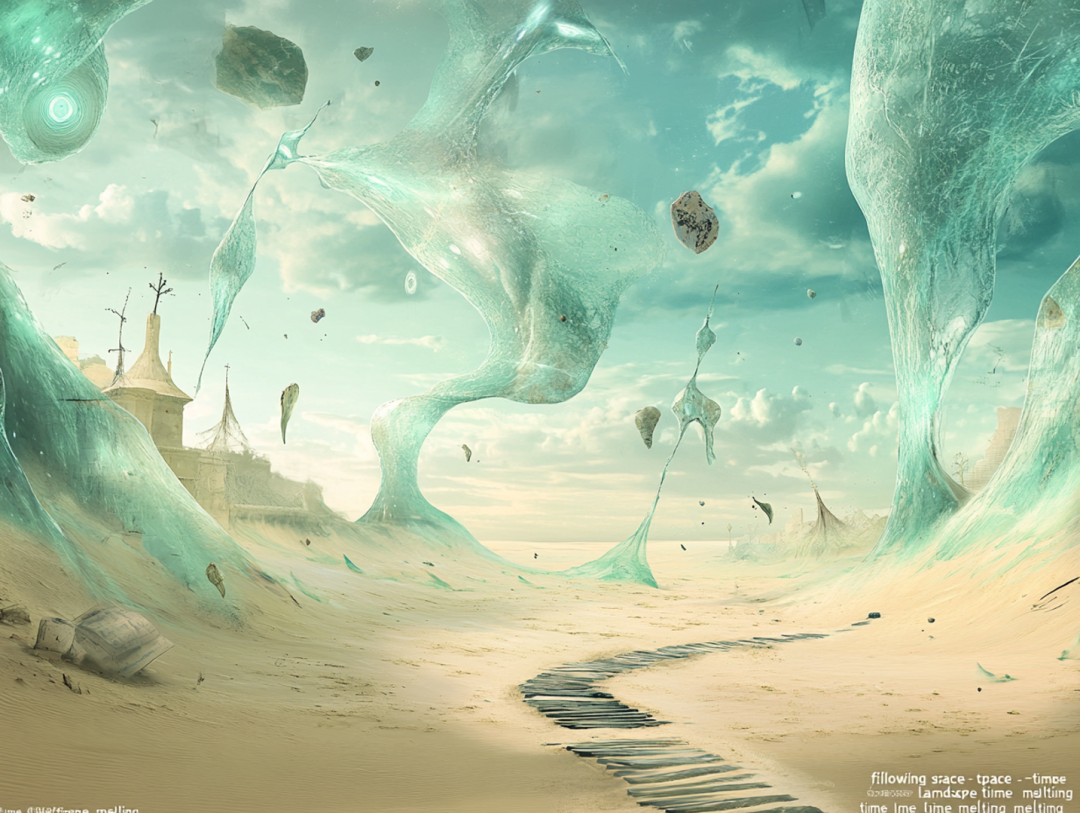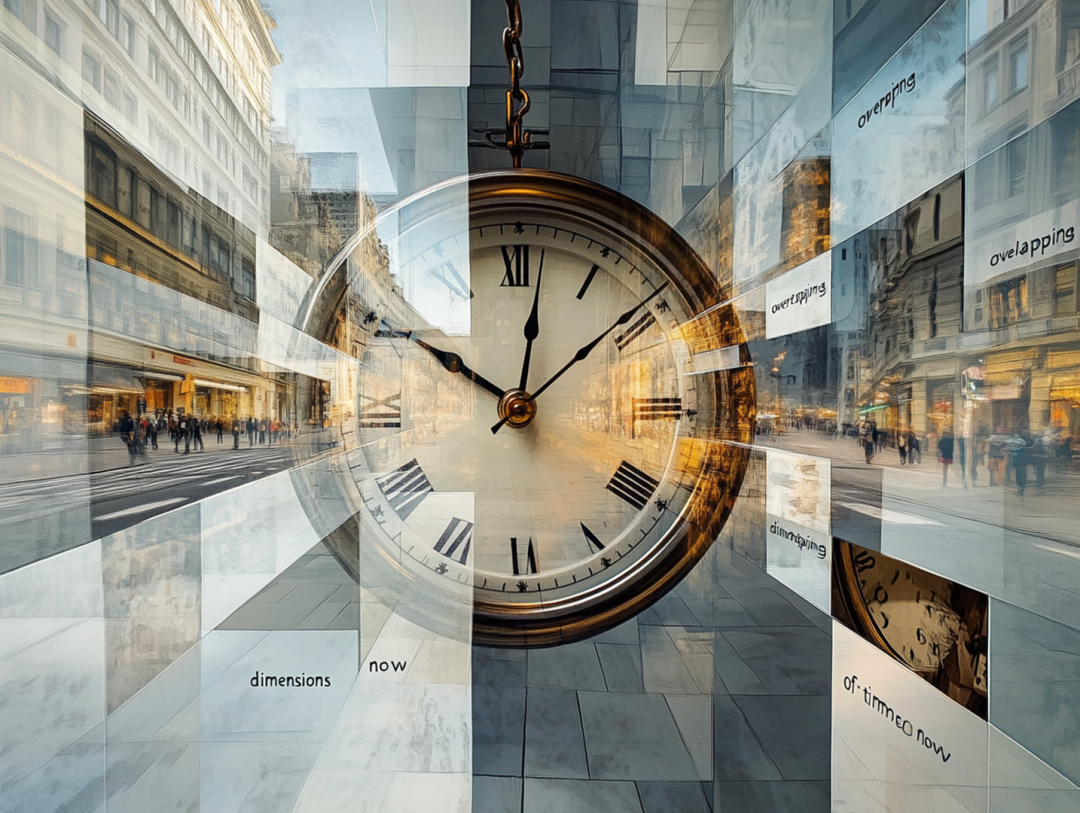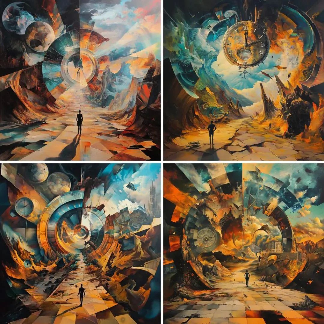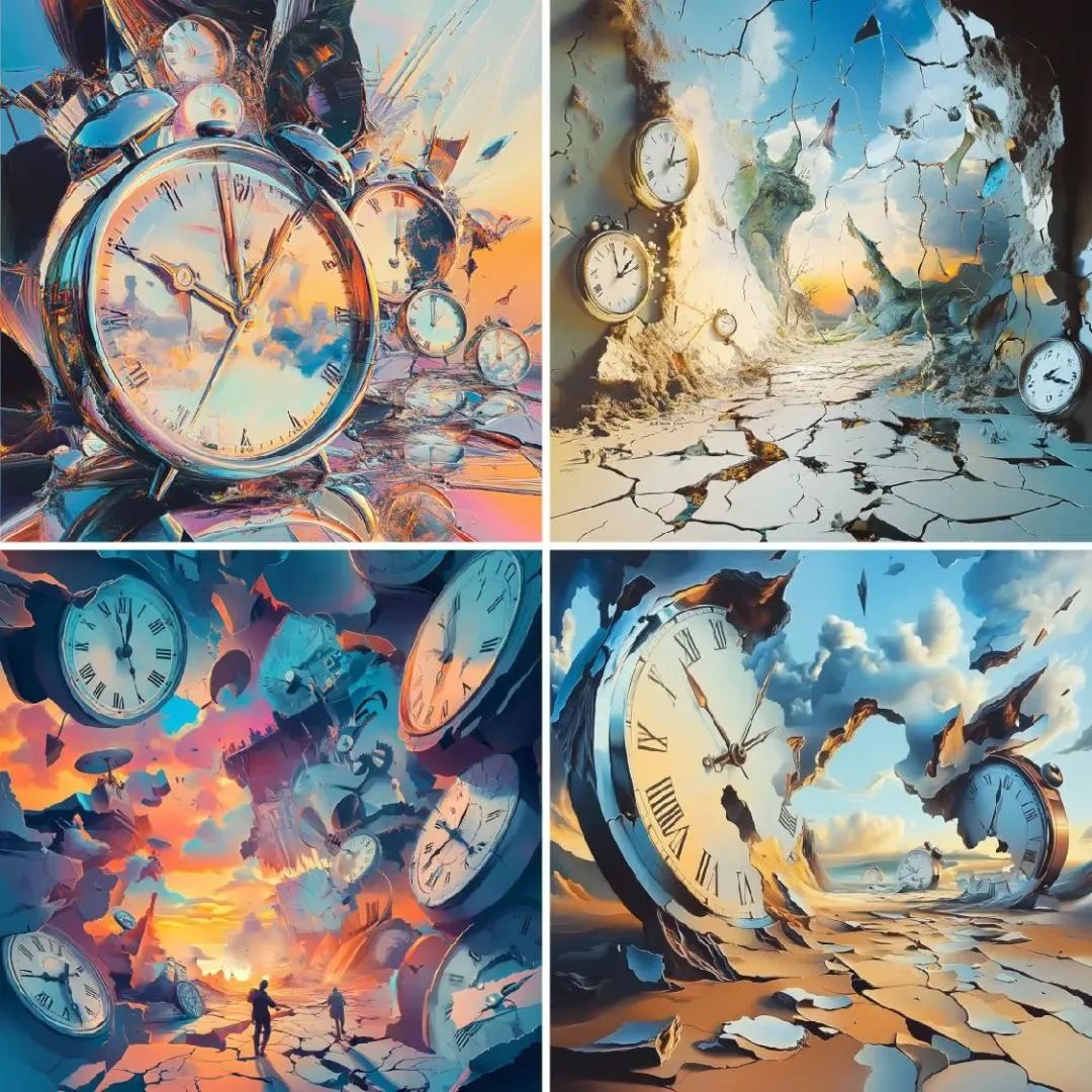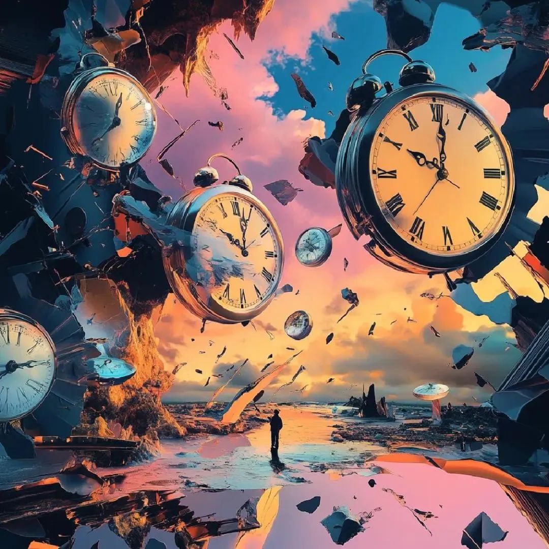 MJ / #prompt:Surrealistic abstract time perception, overlapping melting clocks, distorted figures, and fragmented landscapes. Show past, present, and future coexisting in one scene, with stretched and compressed elements, representing psychological time manipulation. Use vibrant gradients, contrasting light and shadow, and broken timepieces to evoke emotional shifts and subjective time flow