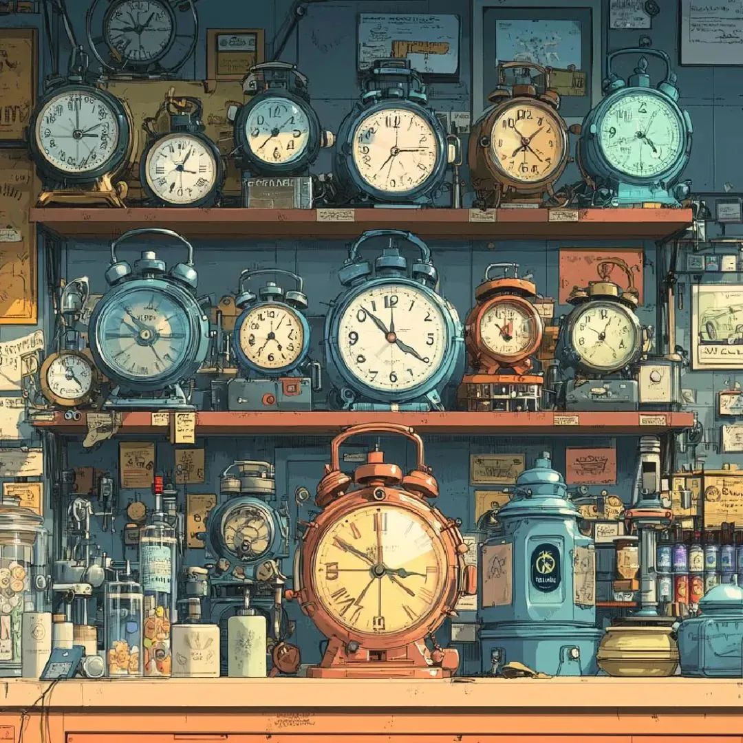 MJ / #prompt:A time convenience store, comic style, jars shaped like clocks, various items in the shape of time symbols such as hourglasses, sundials, and watches, warm and whimsical atmosphere, vibrant colors, detailed line art, imaginative and surreal design